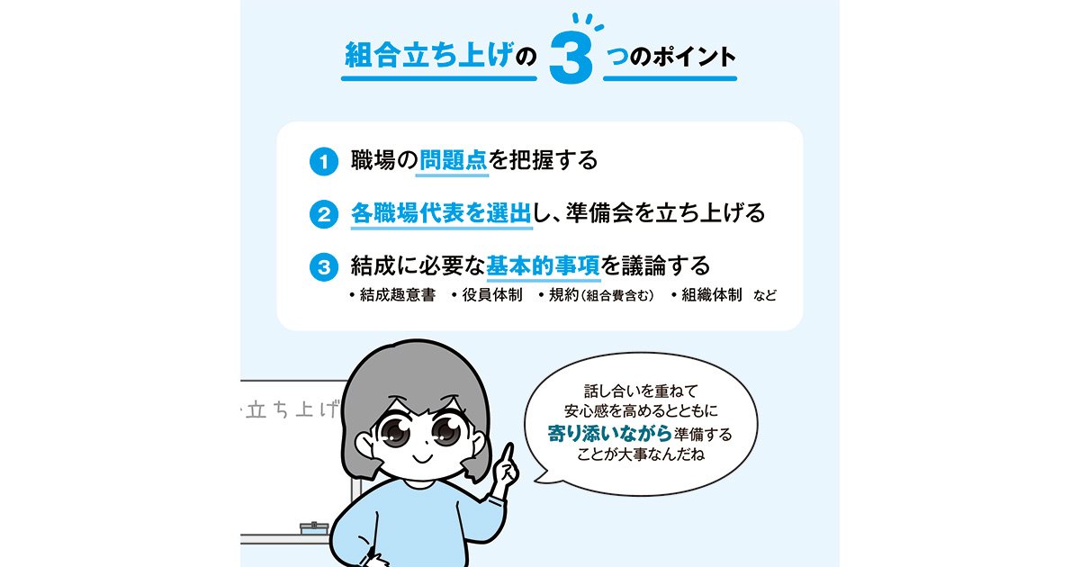 具体的な手順や作業などはひな型がありますので、その職場に合わせてアレンジしますが、結成に向けての大きな壁は、役員のなり手と組合費です。準備会メンバーとの話し合いを重ね、安心感を高めるとともに寄り添いながらの準備を心がけています。
