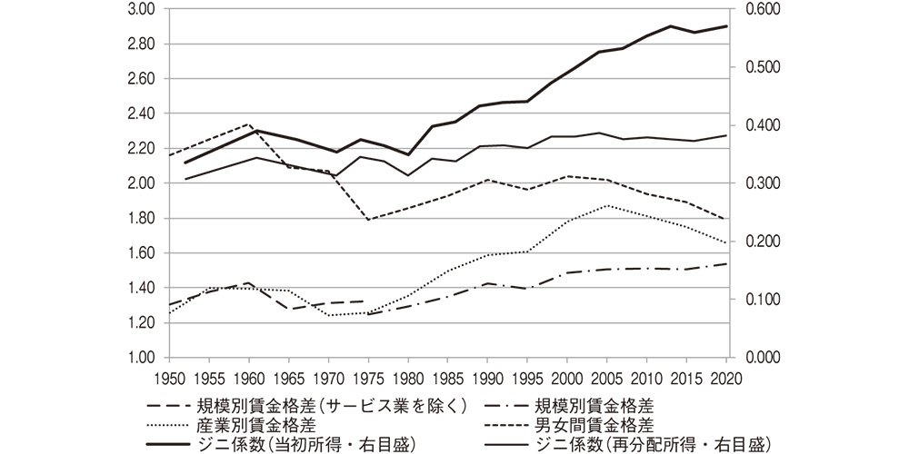 戦後日本の所得格差は、1960年から1974年の高度経済成長期にかけて縮小しました。その後、格差拡大が始まり、バブル期とそれ以降に格差が急速に拡大しました。2010年代の変化を見ると若干の横ばい傾向です(図1)。
