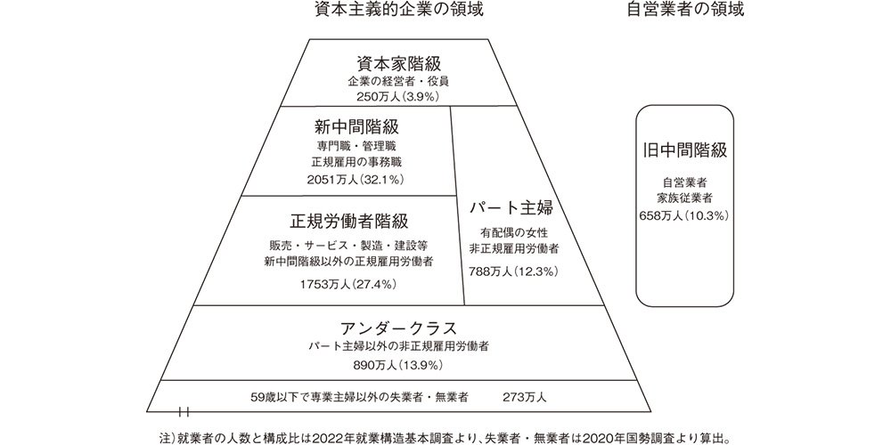『新しい階級社会』(講談社現代新書)という本で私は、「パート主婦」を除く非正規労働者を「アンダークラス」と名付けました。2022年時点で「アンダークラス」は約890万人いました(図2)。その数は、1992年の約392万人から2012年の約928万人に拡大し、2022年は減りましたが高止まりです。この層はいまや自営業者などの「旧中間階級」(658万人)より大きくなっています。