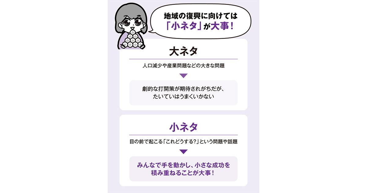 私が講演などでいつも言うのは、地域には「小ネタが大事」ということです。苦しい状況にあると、どうしても一発逆転のホームランや抜本的な解決策を求めたくなります。震災からの復興では、当初の復旧中心の話題から、次第に人口減少や産業衰退などの大きな問題にすり替わっていきます。すると、なおさら劇的な打開策が期待されがちです。しかし、そうした「大ネタ」は、たいていうまくいきません。「大ネタ」に振り回されるのではなく、地道で日常的な「小ネタ」を積み重ねることが何より大事です。