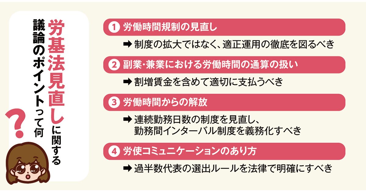 主な論点は四つあります。一つ目は裁量労働制や時間外労働の上限規制といった労働時間規制の見直し。二つ目は、副業・兼業における労働時間の通算の扱い。三つ目は、連続勤務日数の規制や勤務間インターバルといった労働からの解放に関する規制。四つ目は、集団的労使コミュニケーションにおける過半数代表のあり方についてです。