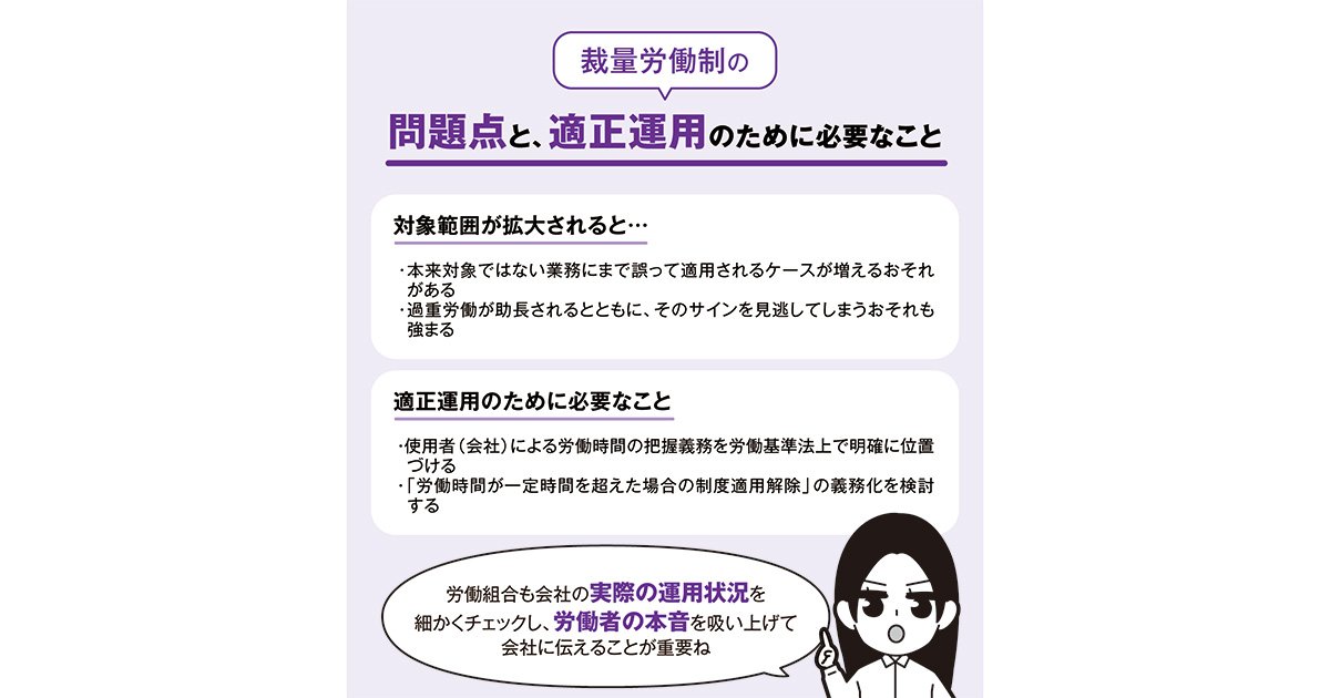 功罪ありますが、フレックスタイムや、早く終われば帰れる制度など、他の方法でも実現できる働き方はたくさんあるはずです。労働組合には、そうした別の提案もきちんとしてほしいと思います。「柔軟な働き方」や「生産性を高める働き方」といった、耳当たりのいい言葉に惑わされず、どうすれば自分たちの働き方を守れるのかを、もう一度立ち返って考えてほしいというのが、私の一番の期待です。